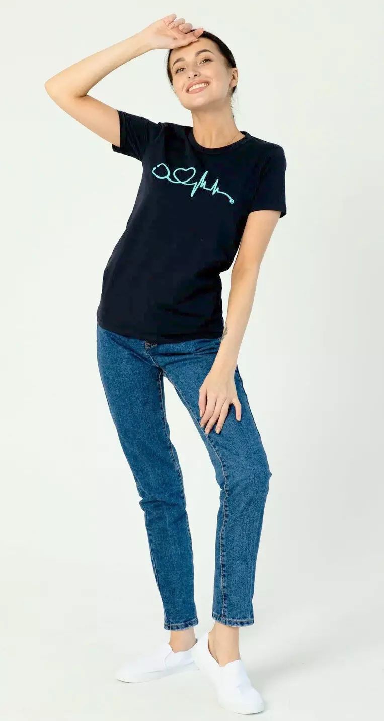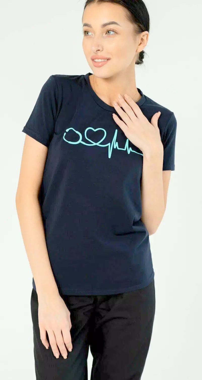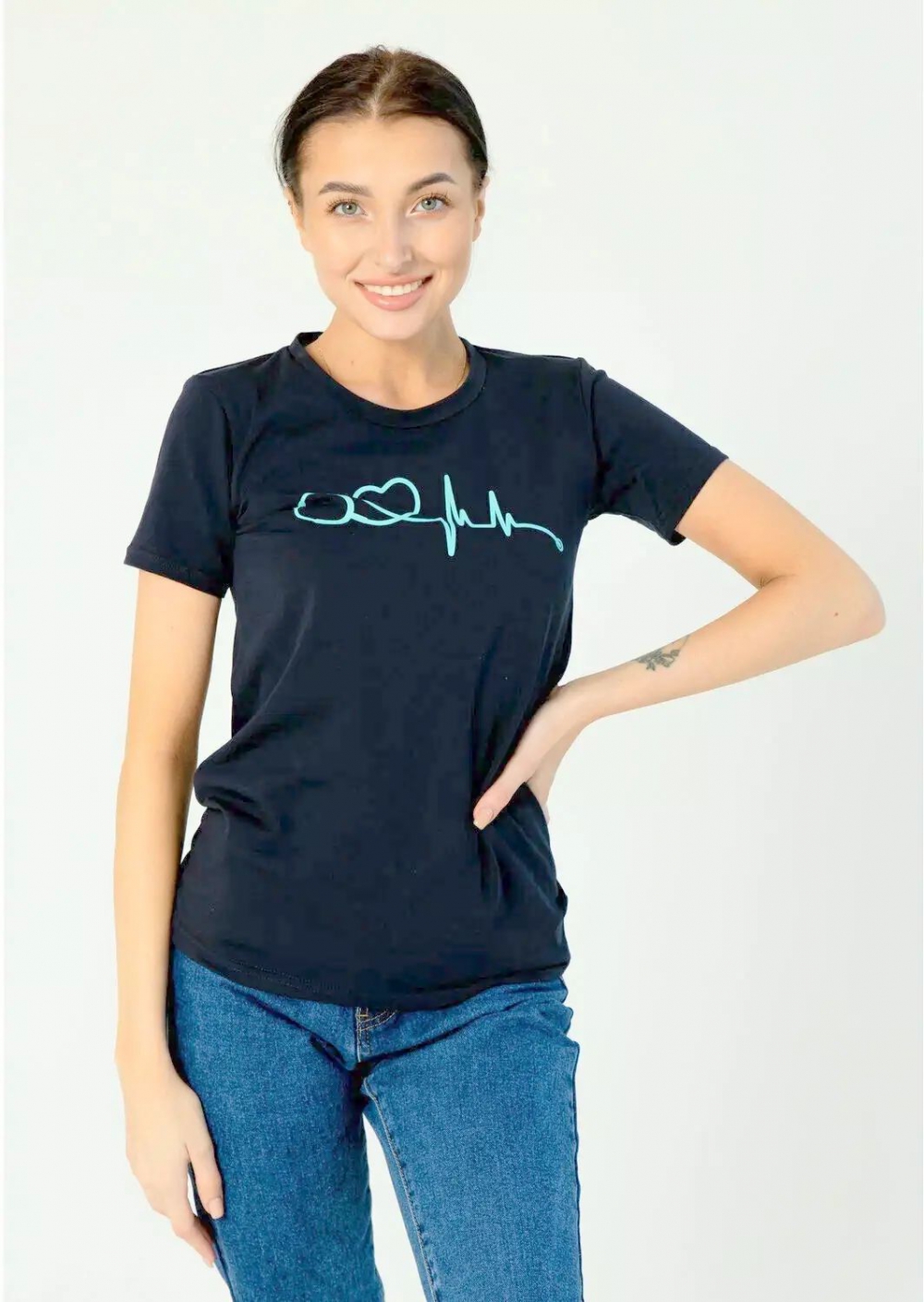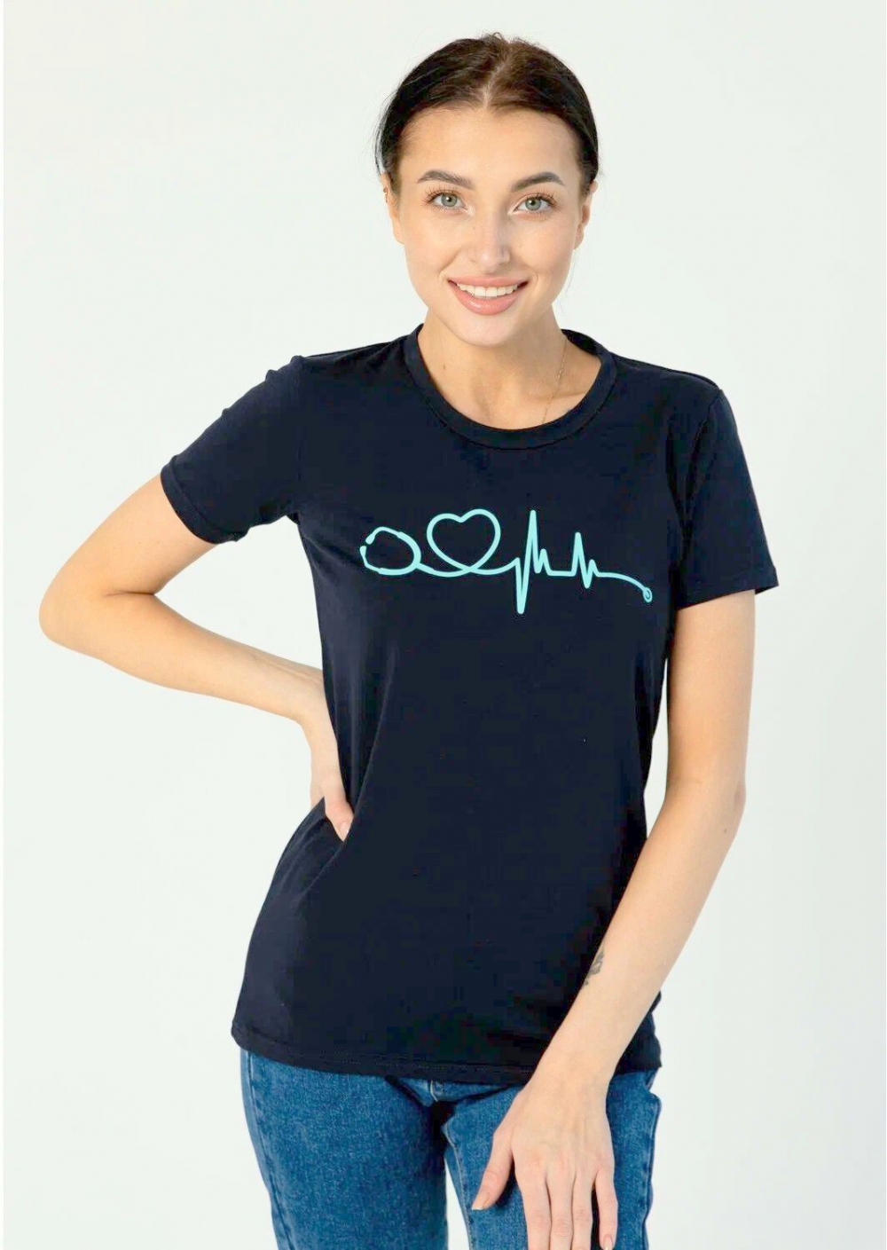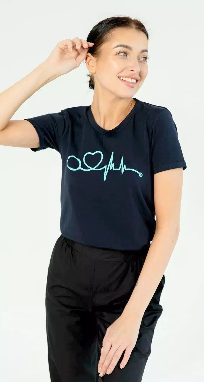 Футболка женская выполнена из трикотажного полотна с содержанием лайкры, что делает ее очень комфортной. Футболка имеет стандартный силуэт с круглым вырезом горловины и укороченным рукавом. Декорированная принтом с медицинской тематикой, она быстро станет любимым дополнением к Вашему профессиональному гардеробу, но при этом являясь универсальным предметом одежды, может использоваться и для повседневной носки.