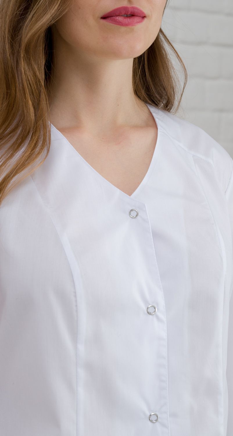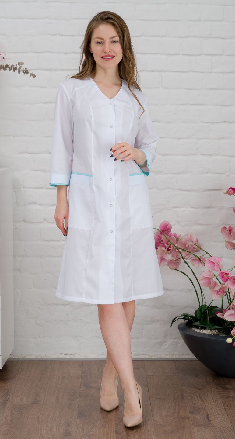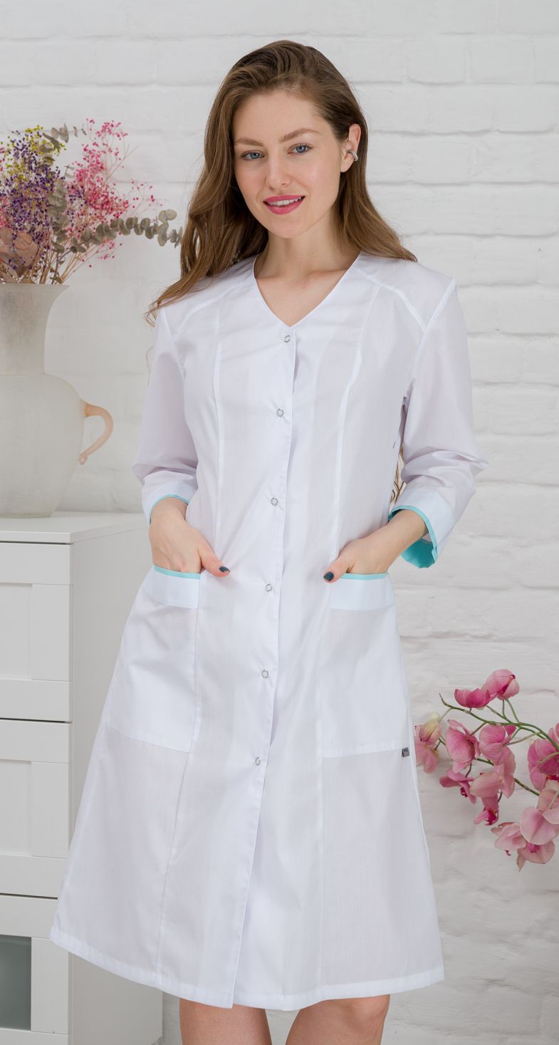 Медицинский женский халат прилегающего силуэта. Застежка центральная на кнопки. Vобразный вырез горловины, рукав короткий. По бокам удобные карманы. Рукава, кокетка и карманы обработаны кантом. Медицинский халат - неотъемлемый атрибут любого медицинского работника. Он служит не только для защиты от возможных инфекций, но и является визитной карточкой врача или медсестры. Ткань дышащая, проста в уходе. Идеальный вариант одежды для работников медицины.
