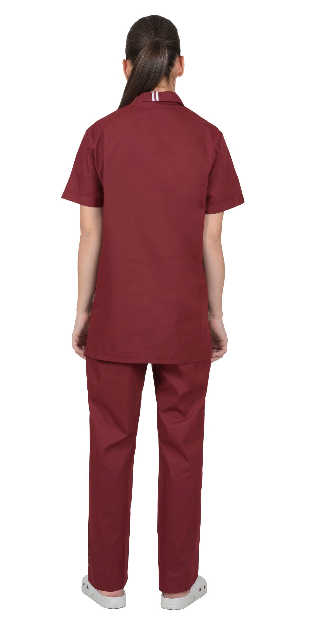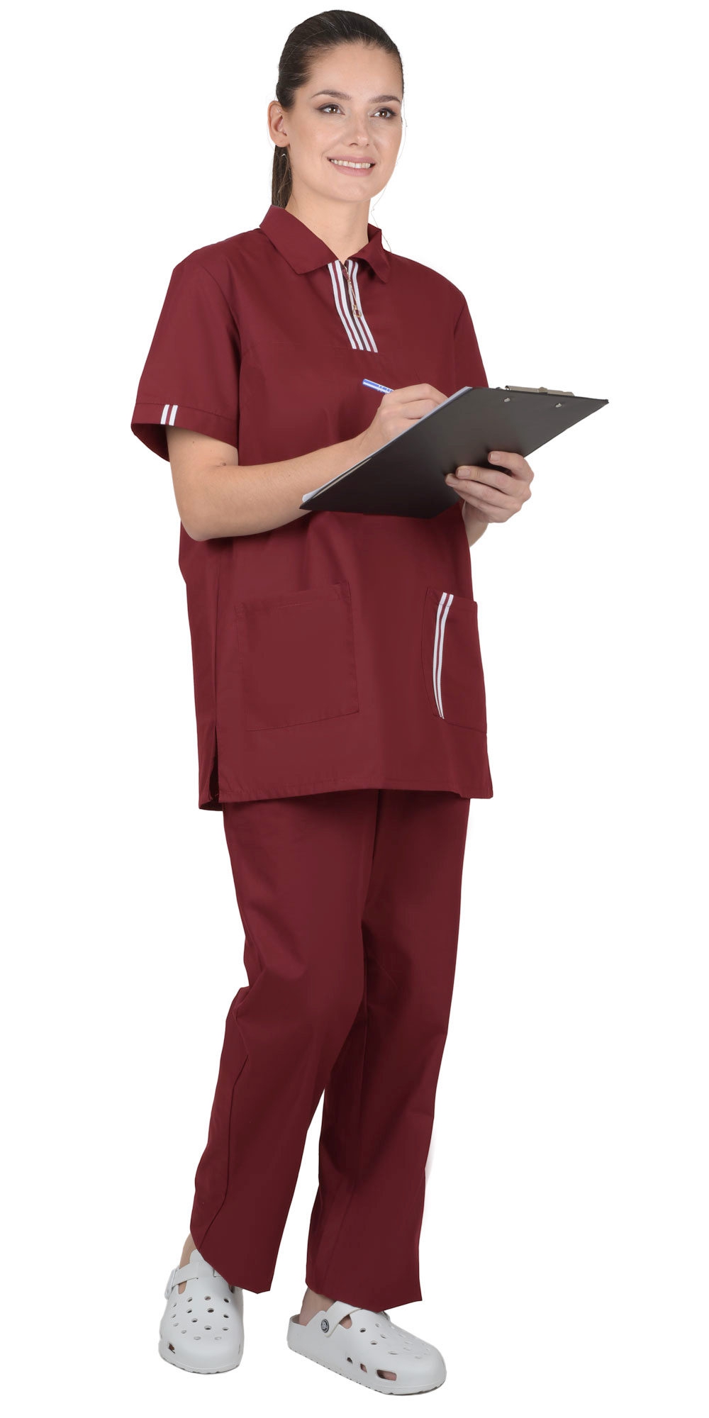 Костюм состоит из блузы и брюк. Блуза прямого силуэта с застежкой на тесьму "молния" в области кокетки. Отложной воротник. Нагрудный левый и два нижних накладных кармана. Рукава втачные, короткие. По низу блузы разрезы в боковых швах.