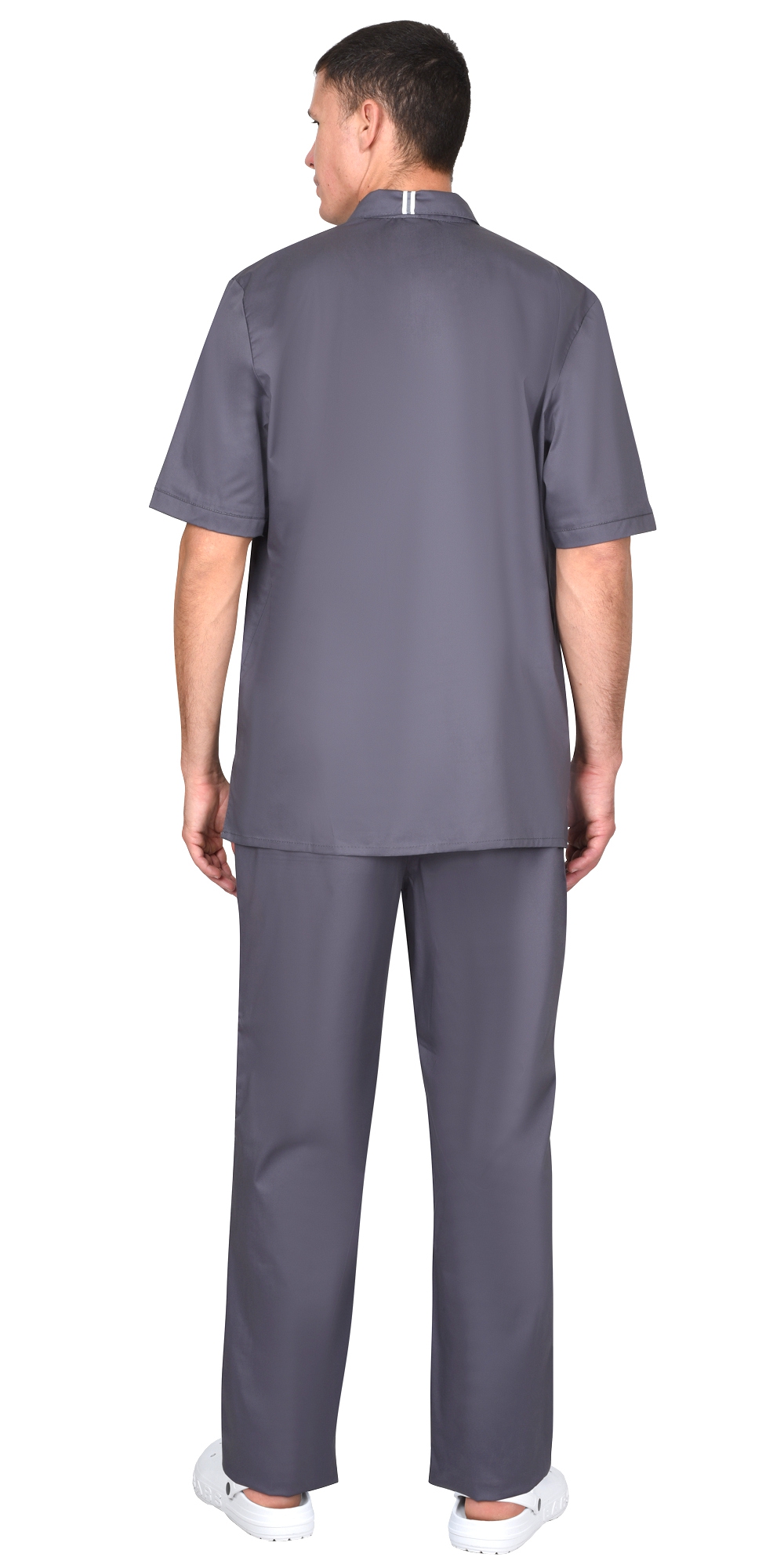 Костюм состоит из куртки и брюк. Куртка прямого силуэта с боковыми разрезами, с застежкой на тесьму - "молния" в области кокетки. Отложенный воротник. Нагрудный левый и два нижних накладных кармана. Рукава втачные, короткие.
