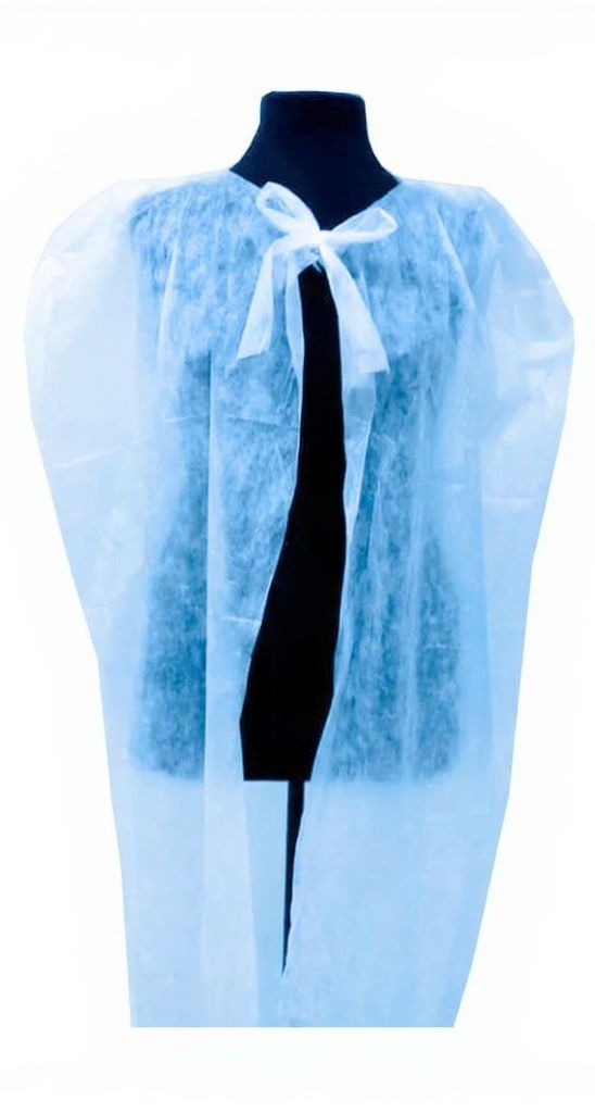 Используется для поддержания гигиенических норм на предприятии. Крепится на теле с помощью завязок на горловине, которые собираются в кулиску. Защищает от заражения пациентов и посетителей в медицинских учреждениях.